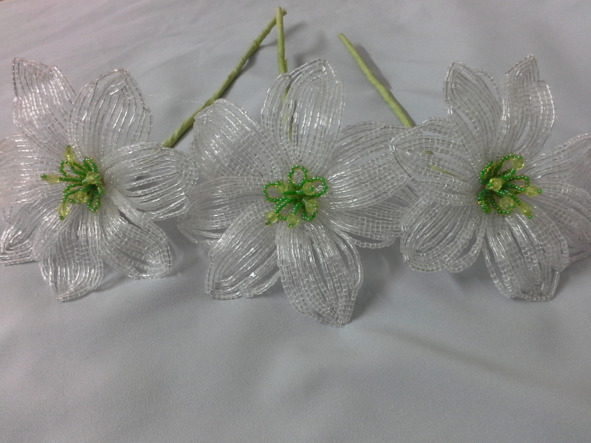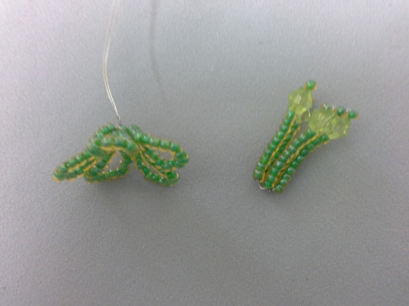 Материалы: жёлтая рубка-50гр.,тёмно-зелёный бисер и зелёный по 30 гр. (смешать),белый -10гр. (тычинки),120 бусин 4мм. (жемчужные) для тычинок, рубка прозрачная-50гр.,2 оттенка светло-зелёного бисера-30гр., зелёная рубка-100гр.,оранжевая рубка-50гр.,тычинки-27 пар, 9 жёлтых прозрачных бусин 5—6 мм., проволока для плетения, тейп-лента зелёная и светло-зелёная,