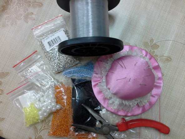 Материал: леска, бисер оранжевый и черный, иглы для бисера, круглогубцы, пины, бусины, колечки двойные, цвет серебро, 5 мм.