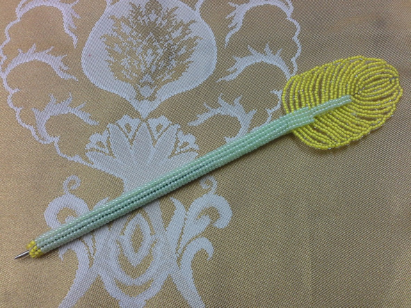 Материалы: чешский бисер бледно зелёного цвета и прозрачный с жёлтой серединкой, леска, проволока, стержень для ручки шариковой.