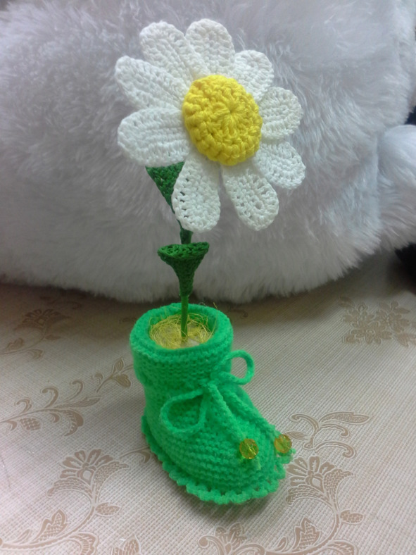 Вяжем пинетку по любой знакомой схеме, в носочек пинетки набиваем любой полиэтиленовый пакет, а там где пяточка и резинка вставляем колпачок от лака для волос. Покрываем всю пинетку клеем ПВА.