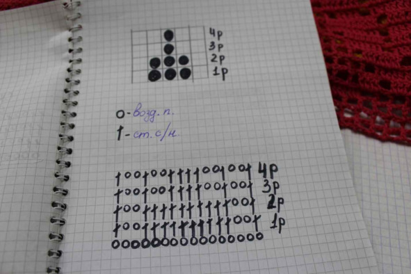 Начинаем вязание с зелёной пряжи по схеме.