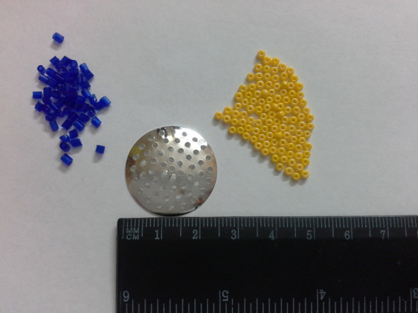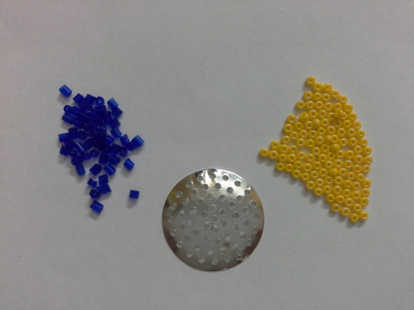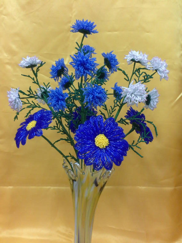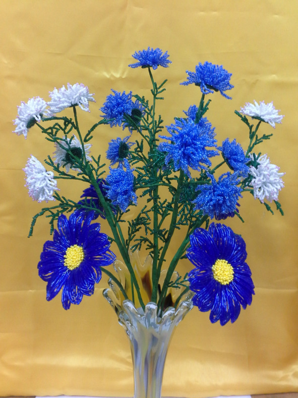 Материалы: рубка синяя 30гр., желтый бисер 20 гр., бисер прозрачный с крашенной серединкой (синий) 50гр., бисер зелёный 50 гр., бисер белый 50гр.,проволока для плетения 0,3 мм, проволока медная 1 мм., проволока для стебля 3—4 мм., тейп лента, ситечки для плетения цветов 4шт. (2,5 см), ситечки для плетения цветов 18 шт. (1,5 или 1, 7см.)