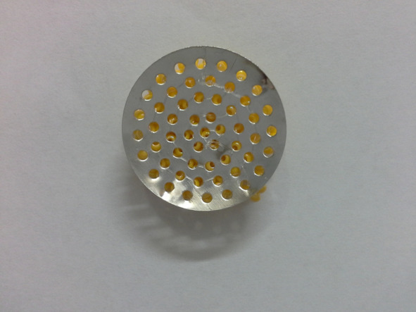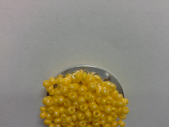 Готовим серединку для гербер, в каждом отверстии прошиваем петельку из желтого бисера, в петельке 8 бисеринок.