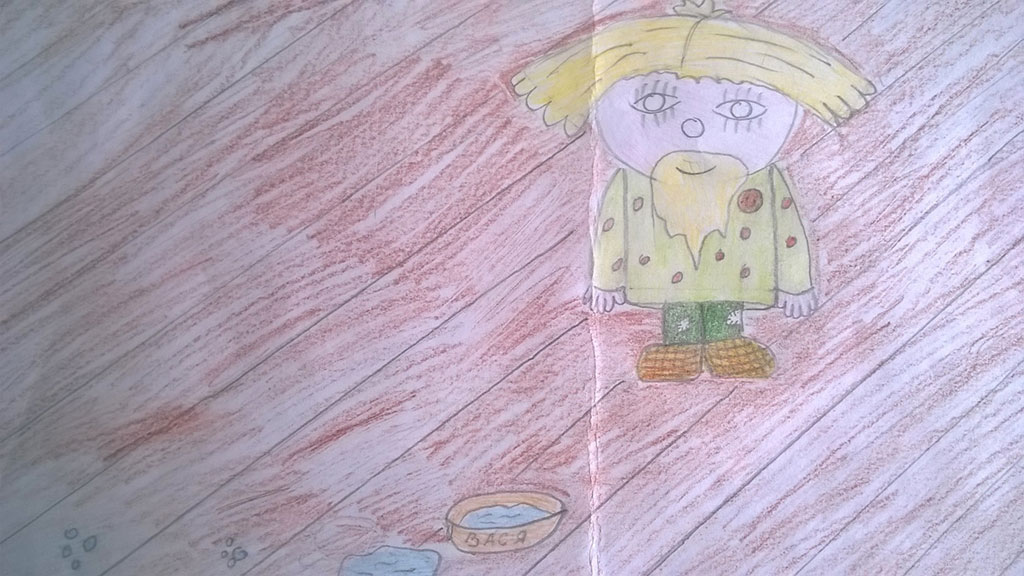 Я переворачиваю страничку книги, как вдруг слышу какое-то шуршание в углу. Мой кот Барсик насторожил уши и стал пристально всматриваться в то место, откуда были слышны эти звуки. Послышался топот чьих-то маленьких ножек и через мгновение передо мной предстает крошечный, но очень симпатичный человечек. Пушистые светлые волосы обрамляют круглое веселое лицо, покрытое веснушками; в зеленых умных глазах играют задорные искорки, а щеки румяные, словно спелые яблоки. Забавный человечек к тому же выглядит очень нарядным: ярко-зеленая рубашка и малиновые штанишки, подпоясанные золотистым пояском. При его появлении кот заурчал, поднял хвост трубой и вылетел из комнаты стрелой.