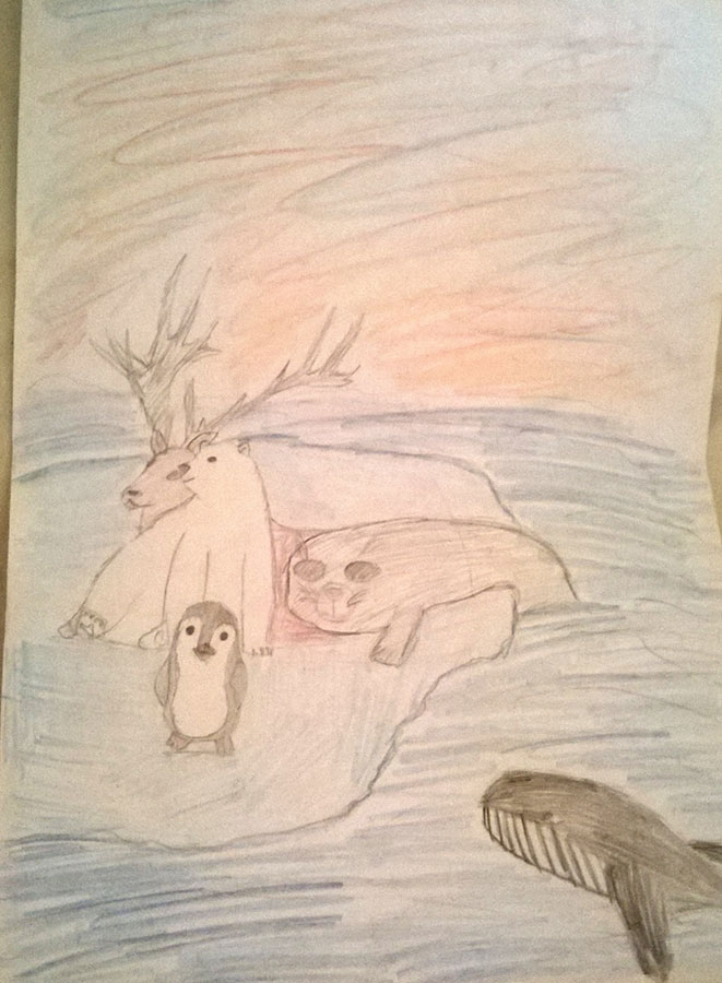 Я оглянулась и увидела необычную картину: к нам с разных сторон двигались пингвин, тюлень, а рядом с льдиной сверкнул фонтан, выпущенный огромнейшим китом.