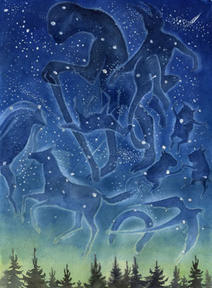 Разбуженный беседой ветер гнал за спиной у лошади низкие тучи, затягивал небо мутной пеленой. Звёзды гасли одна за другой, исчезая за тяжёлыми мрачными облаками. А по ним, разбрызгивая копытами тьму, мчался небесный табун – вестник скорой зимы и снега. Кони неслись над землёй – чёрные силуэты, непокорные призрачному свету луны. Кобыла наклонила голову, любуясь скачкой. Вдруг, встряхнув гривой и громко заржав, она прыгнула вверх, разметав сгущавшиеся тучи, и помчалась вперёд сквозь свинцовые облака, недосягаемая ни для ветра, ни для лошадей небесного табуна.