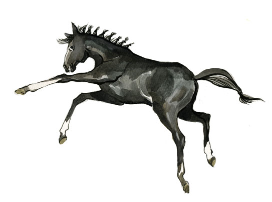 Из конюшни донеслись шаркающие шаги конюха, и тут же – незнакомая дробь копыт. Марик поднял уши, шумно втянул ноздрями колючий воздух и насторожился. Из-за угла показался конюх, а рядом с ним подпрыгивала, беснуясь, чёрная туча во вспышках белых молний.