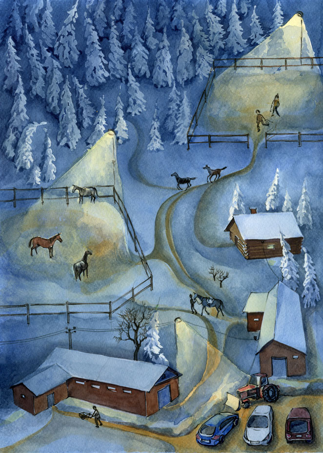 В конце концов ворота открылись, и жеребят повели домой по вкусно хрустящей снежной тропинке. Тяжёлые ветви деревьев низким пологом нависали над головами, а из сугробов то тут, то там выглядывали молодые ёлочки. Марик на ходу скусывал кончики их веток. Это занятие так увлекло его, что он не заметил, как очутился на поле.
