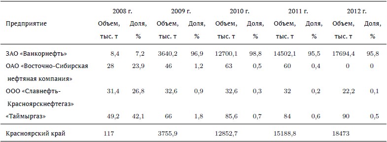 Объемы добычи нефти в разрезе предприятий на территории Красноярского края в 2008—2012 гг. представлены в табл. 1.1.