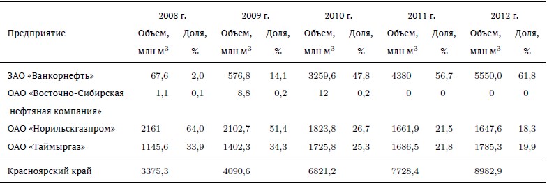 Таблица 1.2. Объемы добычи газа в разрезе предприятий на территории Красноярского края в2008—2012 гг.