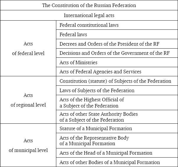 The system of legislation of the Russian Federation consists of three levels: federal, regional (at the level of subjects of the Federation), and local (at the level of municipal entities). At the top of the pyramid of normative acts is the Constitution of the Russian Federation. Moreover, the Russian Federation is a party to several binding international treaties.