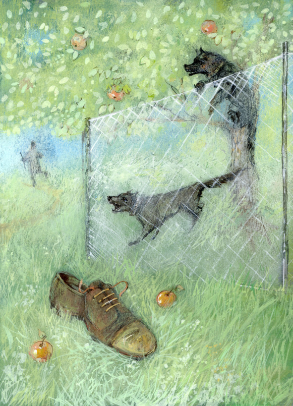 Не завязанные вовремя шнурки как-то растворились в пространстве. Бродяга медленно плелся вдоль забора, шлепая замызганными штиблетами. Над головой свисали из-за высокой изгороди спелые яблоки. Скиталец стал выискивать глазами яблоко поспелее, и постепенно голова задиралась все выше и выше. Аппетит возрастал. Наконец он увидел ветку с наливными сочными плодами, но достать их не было никакой возможности. Бродяга стал подпрыгивать, стараясь дотянуться до яблок. Огляделся, увидел неподалеку валяющуюся палку. Вооружившись ей, он принялся энергично охотиться за «запретными» плодами. Малый так настойчиво скакал около забора и так сильно бил по яблоне, что разбудил двух сторожевых псов, охраняющих двор и сад.