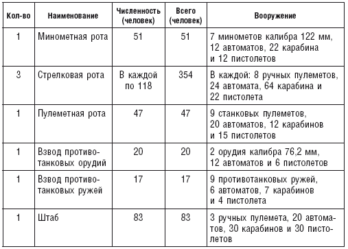 По известным данным, русский стрелковый батальон во время Второй мировой войны имел следующую организационную структуру и вооружение: