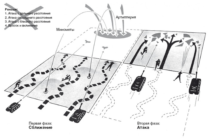 Во-вторых, в условиях современного боя лишь в очень редких случаях удастся уничтожить или подавить огневые средства обороняющегося настолько, чтобы пехота имела возможность под наблюдаемым огнем противника успешно приблизиться к нему на расстояние начиная с 1000 м и до достижения дистанции атаки, равной примерно 100–200 м.