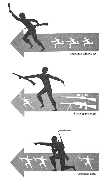 В свете новых задач, стоящих перед пехотной ротой, было бы ошибкой с целью повышения огневой мощи вооружать ее минометами, станковыми пулеметами и другим тяжелым оружием. Командиры рот и взводов должны снова вернуться к выполнению своей исконной задачи – вести подчиненные подразделения в атаку или руководить отражением атаки противника (см. рис 2). В условиях современного боя командир роты не в состоянии одновременно вести взводы в атаку и управлять огнем тяжелого оружия. К тому же темп продвижения роты при сближении и в момент атаки в значительной степени зависит от скорости движения самых медлительных ее подразделений.