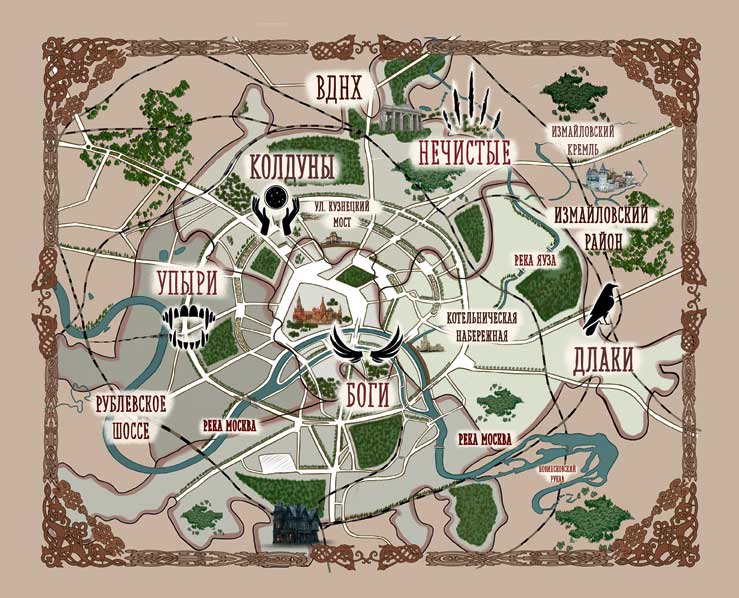 Верви – городские сообщества сверхъестественных существ или созданий, наделенных магическими силами. Вервей в городе пять: боги, длаки, колдуны, нечистые, упыри. Каждая вервь, кроме богов, располагает двумя административными округами Москвы и не имеет права посягать на чужие территории. Однако это не означает, что длаки не могут жить на территории колдунов и наоборот, разница в том, что в определенных округах города живет большинство представителей той или иной верви.