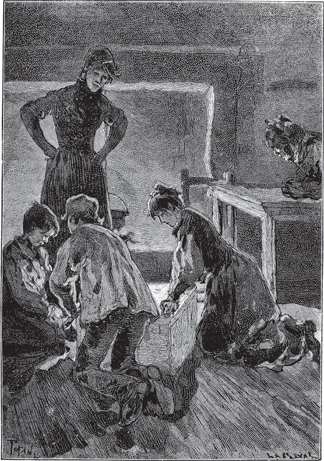 Слезы застилали ей взгляд. Она торопливо спарывала метку с рубашки, которую ей кинула мать, и поранила ножницами руку; из ранки капала кровь, но бедная девочка меньше думала о боли, чем о наказании, которое угрожало ей за то, что она испачкала кровью рубашку, над которой трудилась. К счастью, вдова, погруженная в глубокое раздумье, ничего не заметила.