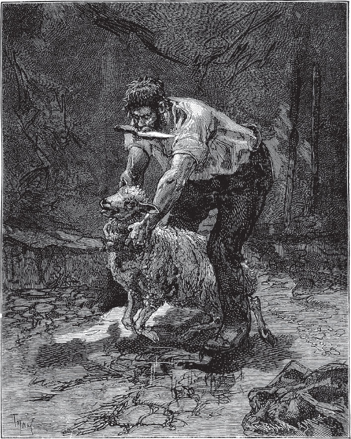 Согнувшись пополам, держа в зубах длинный нож, блестевший в полумраке, он притянул к себе овцу…