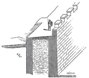 На плане крепости Фамарс в Бельгии (которая описана в «Истории бельгийской архитектуры»), приведенном в нашей книге на рис. 4, хорошо видно, что ее очертания сильно отличаются от обычной конфигурации римских укреплений. Правда, эта крепость была построена не раньше III века н. э. Что касается стен, которые римляне обычно возводили вокруг своих городов, то они состояли из двух параллельных каменных стенок, отстоящих друг от друга на расстоянии 20 футов (6 м). Пространство между ними заполняли землей, которую брали из рвов, и камнями, и все это хорошо утрамбовывали. Наверху делался парапет, который слегка наклоняли в сторону города для стока дождевых вод. Внешняя стена, возвышавшаяся над парапетом, была очень массивной и имела бойницы, а внутренняя только слегка возвышалась над поверхностью земли в крепости. Здесь были сделаны лестницы и наклонные спуски, по которым воины поднимались на парапет (рис. 5).