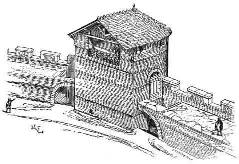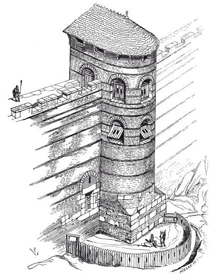 Мы видим, что в передней части ворот сделаны две выемки, С и D. Когда мосты над ними поднимались, связь башни с городом и парапетом полностью прерывалась. Со второго этажа башни на боевую площадку с бойницами можно было подняться по деревянной лестнице, расположенной внутри помещения у плоской стены. С внешней стороны крепости уровень земли находился гораздо ниже первого этажа башни и уровня земли внутри крепости (куда можно было спуститься по лестнице, насчитывавшей всего десять – пятнадцать ступенек). На рис. 7 показана башня и прилегающие к ней участки стен с внутренней стороны (обращенной к городу) без подъемных мостов. Боевая площадка наверху башни защищена крышей и открыта в сторону крепости, что позволяло ее защитникам видеть, что там происходит, а также поднимать камни и другие метательные снаряды с помощью веревок и шкивов[6]. На рис. 8 изображена та же самая башня с внешней стороны, мы добавили сюда еще и боковую дверь[7] (потерну, лат. posterula), которая располагалась на приличной высоте над землей. Для того чтобы добраться до потерны, надо было иметь обыкновенную или веревочную лестницу. Доступ к двери защищал, по обычаю того времени, частокол или барьер. Подобную защиту имели все ворота и боковые дверцы крепостей.