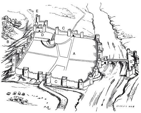 Рис. 9. Вид римского города с высоты птичьего полета: А — город; В — склон; С – крепостные стены; D — замок; Е — сторожевые башни; G — предмостный бастион