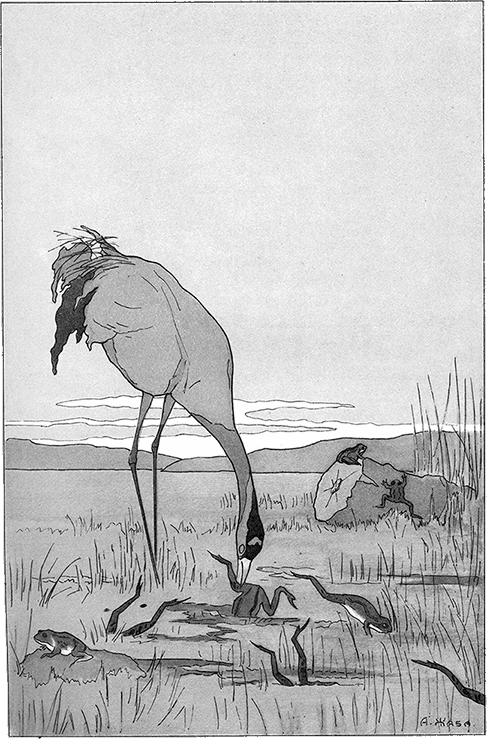 Лягушкам стало не угодно Правление народно,И показалось им совсем не благородно Без службы и на воле жить. Чтоб горю пособить, То стали у богов Царя они просить.Хоть слушать всякий вздор богам бы и не сродно,На сей, однако ж, раз послушал их Зевес:Дал им Царя. Летит к ним с шумом Царь с небес, И плотно так он треснулся на царство,Что ходенем пошло трясинно государство: Со всех Лягушки ног В испуге пометались,Кто как успел, куда кто мог,И шепотом Царю по кельям дивовались.И подлинно, что Царь на диво был им дан! Не суетлив, не вертопрашен, Степенен, молчалив и важен; Дородством, ростом великан, Ну, посмотреть, так это чудо! Одно в Царе лишь было худо: Царь этот был осиновый чурбан.Сначала, чтя его особу превысоку,Не смеет подступить из подданных никто:Со страхом на него глядят они, и тоУкрадкой, издали, сквозь аир и осоку; Но так как в свете чуда нет, К которому б не пригляделся свет,То и они сперва от страху отдохнули,Потом к Царю подползть с преда́нностью дерзнули: Сперва перед Царем ничком;А там, кто посмелей, дай сесть к нему бочком;Дай попытаться сесть с ним рядом;А там, которые еще поудалей, К царю садятся уж и задом. Царь терпит все по милости своей.Немного погодя, посмотришь, кто захочет, Тот на него и вскочит.В три дня наскучило с таким Царем житье. Лягушки новое челобитье,Чтоб им Юпитер в их болотную державуДал подлинно Царя на славу!Молитвам теплым их внемля,Послал Юпитер к ним на царство Журавля.Царь этот не чурбан, совсем иного нраву:Не любит баловать народа своего;Он виноватых ест! а на суде его Нет правых никого; Зато уж у него,Что́ завтрак, что́ обед, что́ ужин, то расправа. На жителей болот Приходит черный год.В Лягушках каждый день великий недочет.С утра до вечера их Царь по царству ходит И всякого, кого ни встретит он, Тотчас засудит и – проглотит.Вот пуще прежнего и кваканье и стон, Чтоб им Юпитер снова Пожаловал Царя иного;Что нынешний их Царь глотает их, как мух;Что даже им нельзя (как это ни ужасно!)Ни носа выставить, ни квакнуть безопасно;Что, наконец, их Царь тошнее им засух.«Почто́ ж вы прежде жить счастливо не умели?Не мне ль, безумные, – вещал им с неба глас, – Покоя не было от вас?Не вы ли о Царе мне уши прошумели?Вам дан был Царь? – так тот был слишком тих: Вы взбунтовались в вашей луже,Другой вам дан – так этот очень лих;Живите ж с ним, чтоб не было вам хуже!»