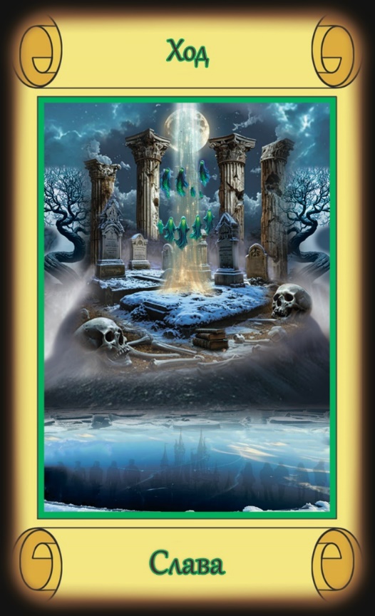 Т.е. для настройки на сефиру Ход нам нужны энергии смерти. Это может быть кладбище, захоронение. Там, где была разрушена связь. Где идет процесс дематериализации. Наше сознание и тело связаны серебряной нитью – это главная связь. При ее разрушении сознание отделяется от тела. Смерть связана с разрушениями связей между телом и сознанием, с тем, что сознание «Я» становится частью эгрегора (правого полушария). Переписывается в него. Т.е. это опять указание на места, где сознание отделилось от тела, где была смерть. Нас интересуют какие-то места, где есть умершие объекты, то, что существовало в нашем мире, но что уже дематериализовалось. Здесь должен быть какой-то восходящий поток, энергия движется от физического плана вверх дематериализуясь. Это может быть какая-то низина с восходящим потоком, возвышенностью. Какое-нибудь захоронение на возвышенности. Курганы с захоронениями. При этом работать с этим местом лучше в полнолуние. В карте 3 аркана изображен молодой месяц, т.е. здесь нас интересует полная луна.