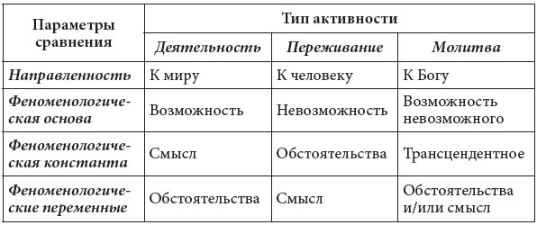 Сравнительные характеристики категорий деятельности, переживания и молитвы