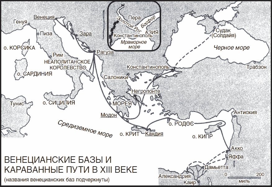 При распределении территорий венецианское правительство стремилось приобрести важные опорные пункты для поддержания власти на море. Искусно проведенный раздел между императором, рыцарями-крестоносцами и венецианцами оказался во многом иллюзорным, ибо после разграбления Константинополя в 1204 году прежняя Византийская империя была, что называется, свободна для захвата. Большие ее куски достались властителям соперничавших с ней греческих городов-государств – Трабзона, Никеи и Эпира. Бонифас Монтферратский потребовал для себя Салоники с большой прилегающей территорией. Племянник Виллардуэна нашел союзников, с которыми намеревался захватить Пелопоннес, тогда называвшийся Мореей. Марко Сануто, племянник Энрико Дандоло, захватил остров посередине Эгейского моря и устроил на нем герцогство Наксоса, которое находилось в подчинении не у Венеции, но у Латинской империи. Остается лишь гадать, какие части Византийской империи потребовал бы себе Энрико Дандоло, не умри он в 1205 году, или его сын и что досталось бы Венеции. Преемник Дандоло, Пьетро Дзиани, сосредоточился на установлении власти Венецианской республики над стратегическими частями империи на море. Он основал несколько военно-морских баз. Верный политике, которую Венеция упорно проводила на протяжении многих веков, Дзиани интересовался не столько данниками, сколько владычеством над морями, в которых ходили венецианские торговые корабли.