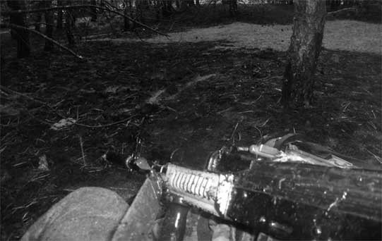 Местность по эту сторону дороги здорово изменилась. Сосенки здесь совсем молодые, чуть выше человеческого роста, и ствол у них очень тонкий, от пули не защитит. Рельеф становится более пересечённым, мы пользуемся этим и двигаемся по низинкам, прячемся за скатами холмов. Деревья растут ровными рядами, длинные просеки просматриваются насквозь. Подлесок и хвоя на земле тоже выжжены, кругом сажа и гарь. Несколько дней подряд шли дожди, пепел смешался с песком, и весь лес покрыт сплошным чёрным ковром.