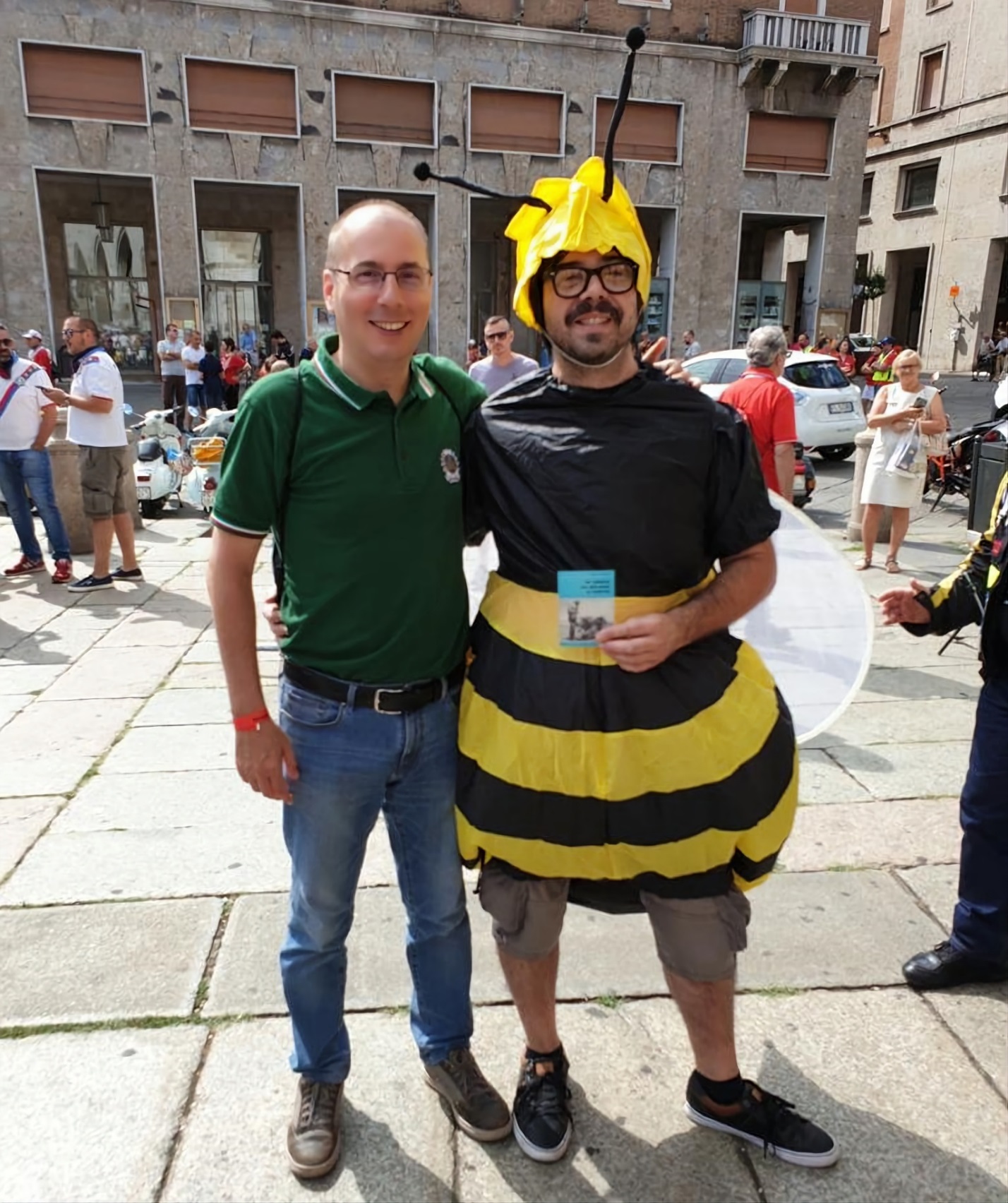 Всего через три дня, 14 июля, мой Vespa Club планировал пышную встречу в честь своего 70-летия. Сотни энтузиастов собрались на площади Пьяцца Кавалли, в городском центре и визитной карточке города. Мы вернулись из больницы накануне вечером, и утром я в сопровождении Бренно поехал на мероприятие. Здесь я впервые встретил Альберто Маркизио из Vespa Club Milano, двоюродного брата Франко. Он связался со мной за некоторое время до этого, сказав, что у него есть специальная наклейка, которую он хочет приклеить к моей Vespa для поездки. Мы никогда не виделись, но я гарантирую, что среди сотен людей он бы сразу узнал меня! Он оказался горячим и восторженным сторонником моего проекта и помог мне его реализовать.