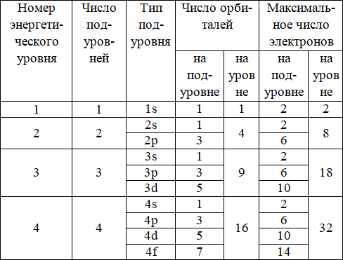 Первый энергетический уровень имеет один подуровень, второй – два, третий – три и т.д.