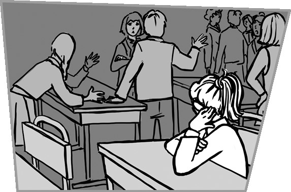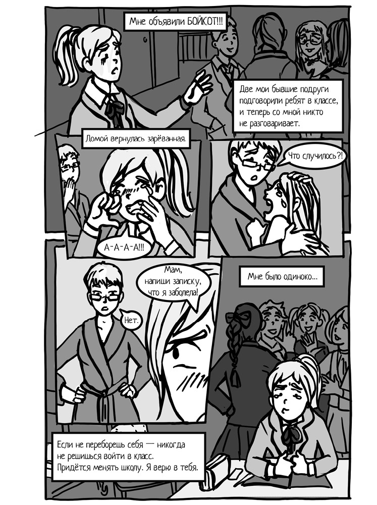 Мне объявили бойкот. Две мои бывшие подруги подговорили ребят в классе, и теперь со мной никто не разговаривает. Во время завтрака я сидела одна, давилась слезами и думала только об одном: «За что? Почему они так со мной? Я ведь ничего им не сделала! Неужели никто ко мне не подойдёт, даже учительница?»
