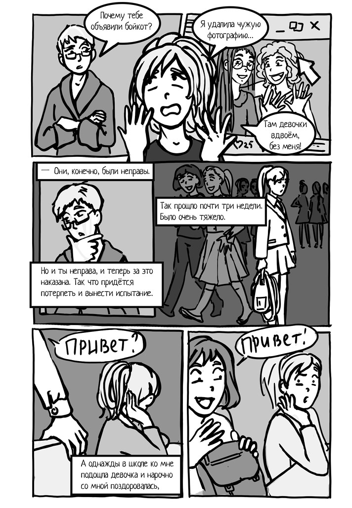– Нет, о ней мы, если честно, не подумали. А потом я заболела и почти месяц не была в школе. И вдруг увидела на страничке в интернете фото, на котором девочки стоят в обнимку. Но ведь мы договаривались, что они не будут дружить друг с другом. Я разозлилась и удалила эту фотку. Тогда мне объявили бойкот.