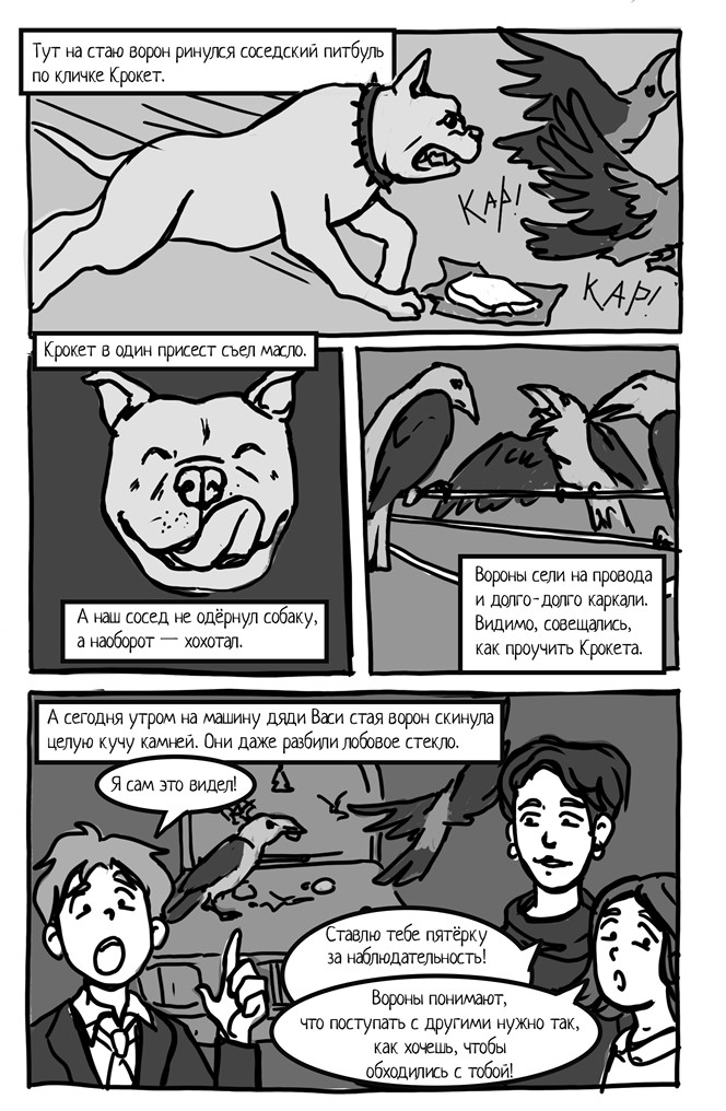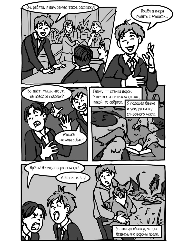 – Повторяю для не слишком умных. Мышка – это моя собака. Гляжу – стайка ворон. Что-то с аппетитом клюют, какой-то свёрток. Я подошёл ближе и увидел пачку сливочного масла. Вороны даже не взлетели, когда Мышка к ним подбежала.