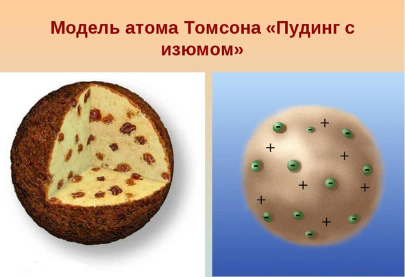 Чтобы это объяснить в 1902 году, господин Уильям Томпсон, более известный как Лорд Кельвин, предложил свою модель строение атома, а уже Джон Томпсон её исследовал более подробно, поэтому эта модель известна как модель Томпсонов. Эта модель была популярна до 1904 года и более известна как «модель пудинга с изюмом». По этой модели атом полностью состоит из положительной материи, а внутри неё находятся электроны, свободно перемещаясь. И при помощи этой модели, вполне получалось описывать некоторые результаты.