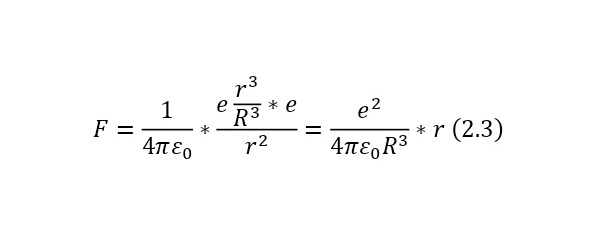И если уже подставить это значение под силу Кулона, получается (2.3), довольно интересное выражение, которое прямо пропорционально расстоянию, на которое отдаляется электрон от центра.