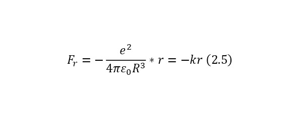 Также для дальнейшего удобства здесь можно ввести понятие, что коэффициент вне радиуса мнимой сферы, это колебательная жёсткость (2.4), а если записывать с этой жёсткостью уже не саму формулу силы Кулона, а его проекцию на радиус мнимой сферы, то получится выражение (2.5), причём отрицательный, за счёт того, что вектор силы и само расстояние (направление электрона) противоположны.