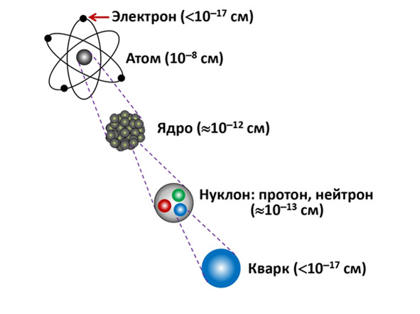 Ядро же само является составным и состоит из частиц именуемые нуклонами, при дальнейшим приближении можно убедиться, что внутри ядра имеется 2 типа нуклонов: протоны и нейтроны. Каждый из них по собственному размеру приблизительно составляет 10—13 см. А при дальнейшем приближении можно наблюдать уже более малые частицы – кварки. Кварки сами по себе являются уже точечными частицами и имеют размер также меньший 10—17, как и электроны.