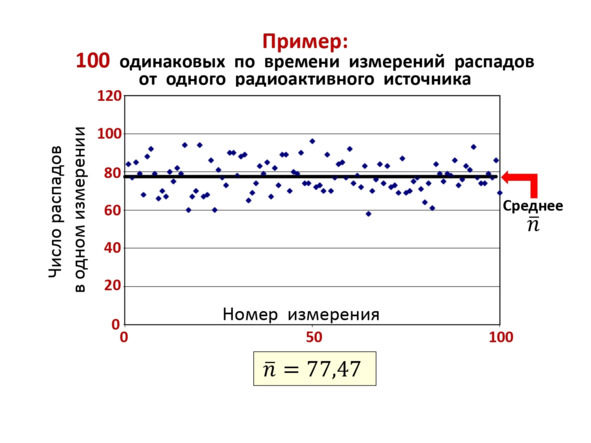 В качестве экспериментального анализа этого явления, можно показать следующее. Было проведено 100 измерений за одинаковый промежуток времени и при этом измерено число распадов. В результате был получен график на (Рис. 2.9), где среднее число распадов равное 77,47 совпало со значением в (2.12), что является ярким доказательством верности общей закономерности.