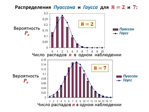 Если же выражать эти две закономерности на графиках, можно получить почти совпадающие картины с увеличением среднего числа распадов. К примеру если среднее число распадов равно 2, то имеет место некоторая разница в результатах по распределению Пуассона и Гаусса, но когда это число, к примеру, достигает 7 и больших значений, эта разность становится всё менее значительной, что показано на (Рис 2.10).