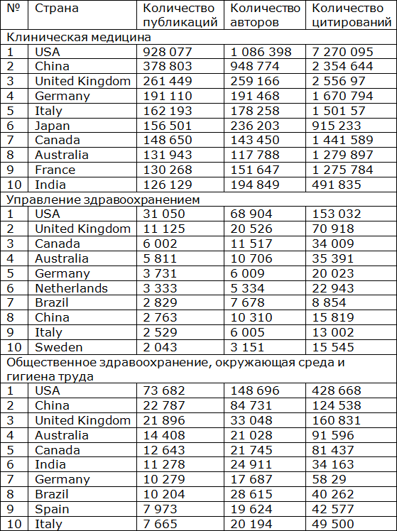 Базовое представление о месте страны в научном мире можно определить по общему числу публикаций, проиндексированных международными базами научных статей. Общая статистика публикационной активности стран с 2017 по 2020 год по рубрикам «Клиническая медицина», «Управление здравоохранением», «Общественное здравоохранение, окружающая среда и гигиена труда» на основании данных Scopus представлена в таблице 1.2.1.