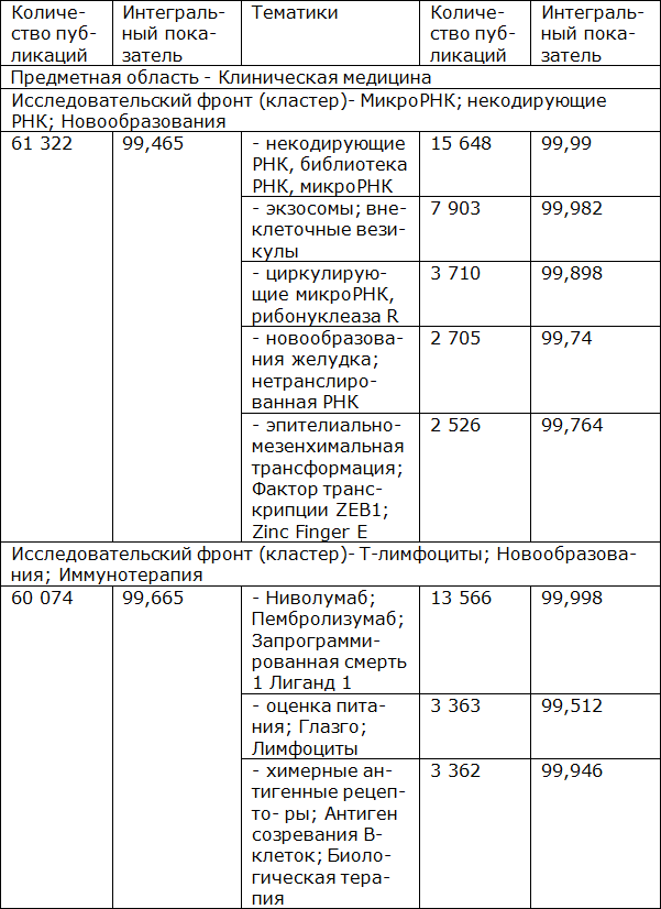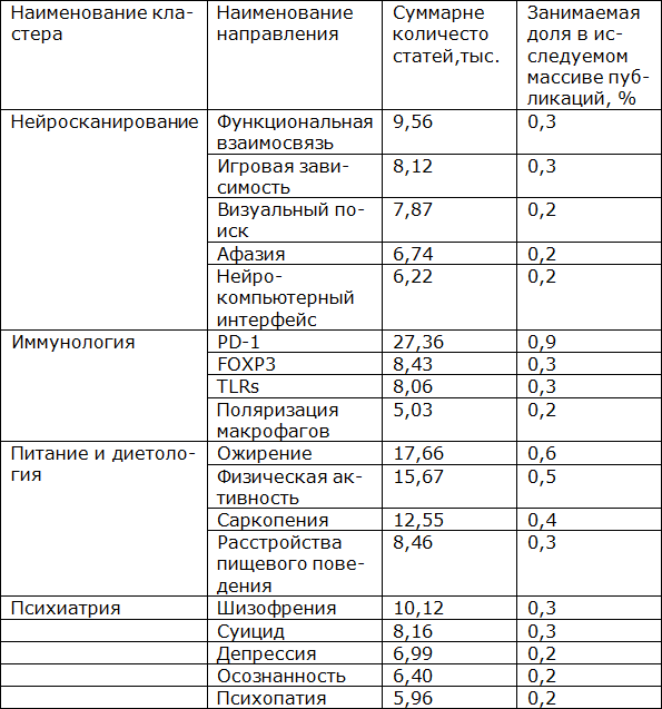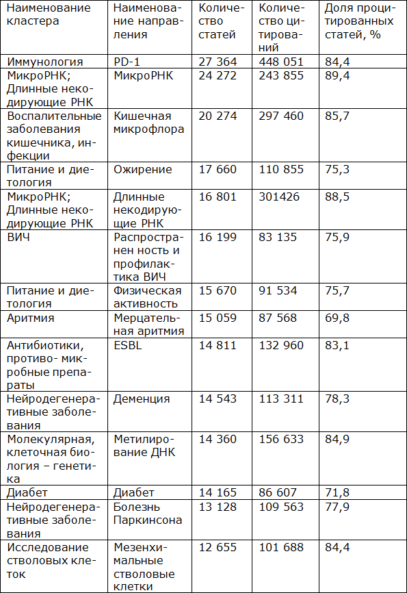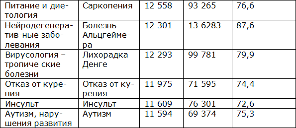 В формировании глобальной исследовательской повестки по суммарному количеству статей и доле, которую направление занимает в исследуемом массиве публикаций InCites Citation Topics, определилось несколько глобальных исследовательских фронтов – это нейросканирование (84,6 тыс. статей – 2,7 %), иммунология (78,9 тыс. статей – 2,5 %), диетология (75,2 тыс. статей – 2,4 %), ортопедия (63,8 тыс. статей – 2,0 %) и психиатрия (62,8 тыс. статей – 2,0 %), которые представлены в таблице 1.2.6.
