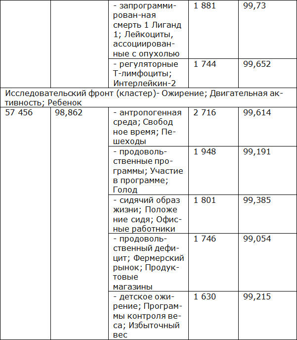Совместное цитирование указывает на смысловую близость таких работ и позволяет рассматривать весь кластер как область особого внимания ученых к некоторой проблеме, намечает «передний край» науки и приоритетные направления ее развития, способные принести наиболее перспективные результаты в долгосрочном периоде (табл. 1.2.3).