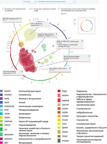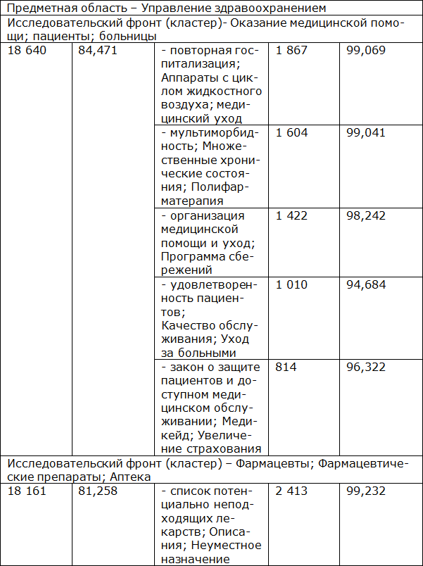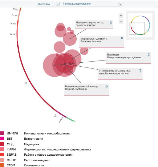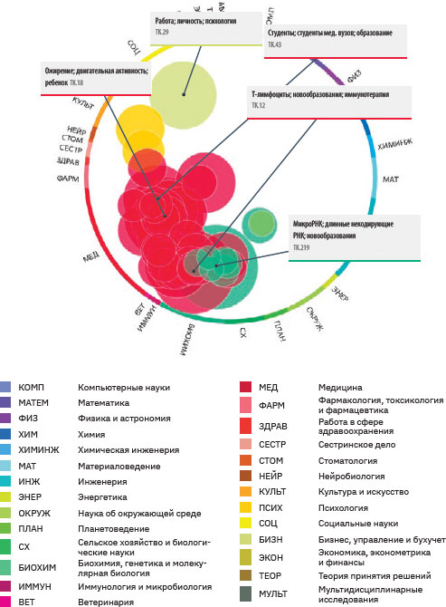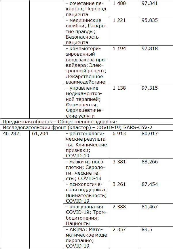 С помощью методологии выделения направлений (topic) и кластеров направлений (topic cluster) SciVal (по состоянию на 05.05.2021) нами были выделены три предметные области: клиническая медицина, управление здравоохранением и общественное здравоохранение. Topic формировался при наличии в группе отобранных работ не менее одной входящей в топ 1 % самых цитируемых, либо одного grant acknowledgement за последние три года.