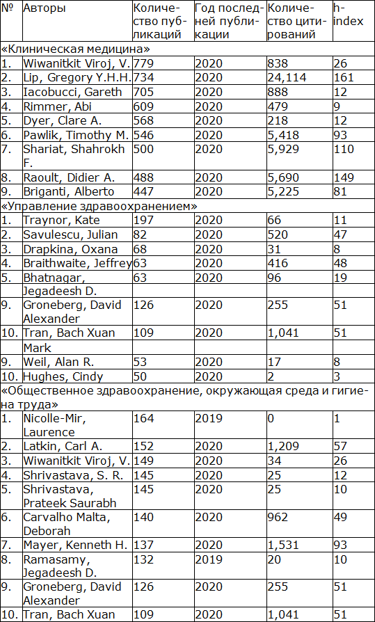 Сравнительная характеристика самых публикуемых ученых в рубриках «Клиническая медицина», «Управление здравоохранением», «Общественное здравоохранение, окружающая среда и гигиена труда» представлена в таблице 1.2.4.