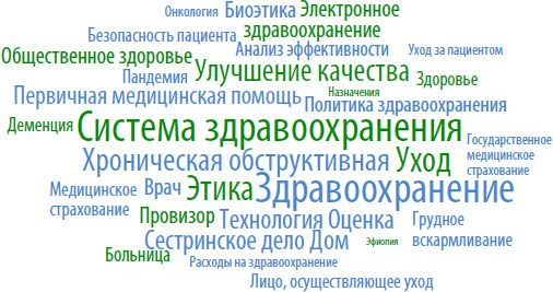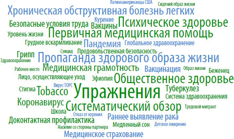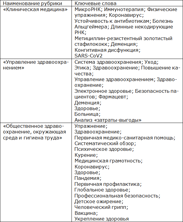 Как правило, анализ ключевых фраз и слов целевая аудитория использует для поиска интересующего материала, а для определения тематической и терминологической области поиск ключевых фраз и слов является определяющим для глубины терминологической специализации исследования. Визуализация топ-50 ключевых слов с 2017 по 2020 год по рубрикам: «Клиническая медицина», «Управление здравоохранением», «Общественное здравоохранение, окружающая среда и гигиена труда» на основании данных Scopus представлена в таблице 1.2.5.