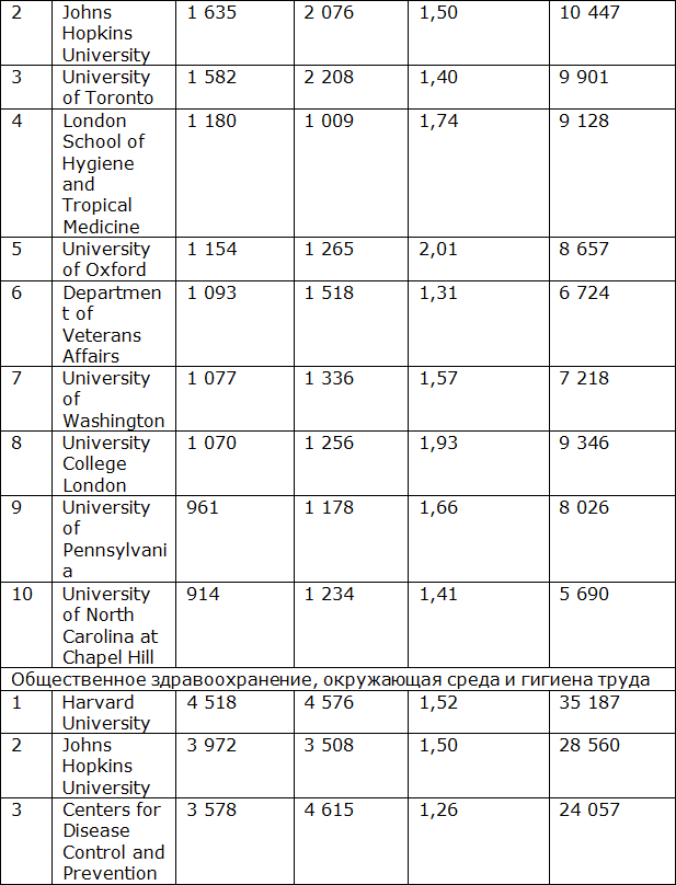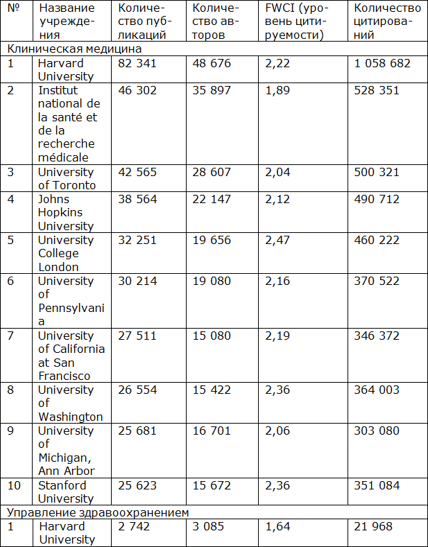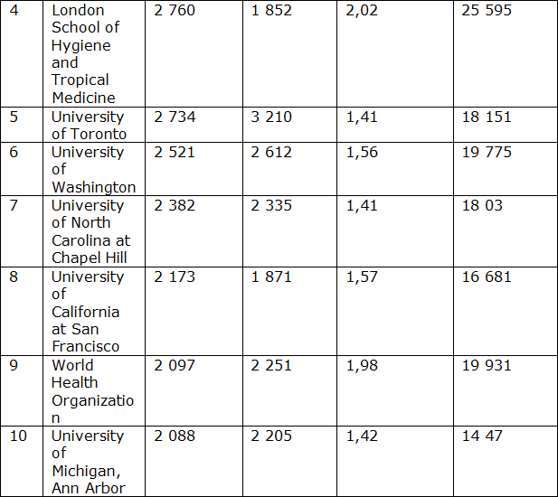 Ниже представлена сравнительная характеристика публикационной активности топ-10 мировых научно-исследовательских институтов за период с 2017 по 2020 год по рубрикам: «Клиническая медицина», «Управление здравоохранением», «Общественное здравоохранение, окружающая среда и гигиена труда» на основании данных SciVal (табл. 1.2.2).