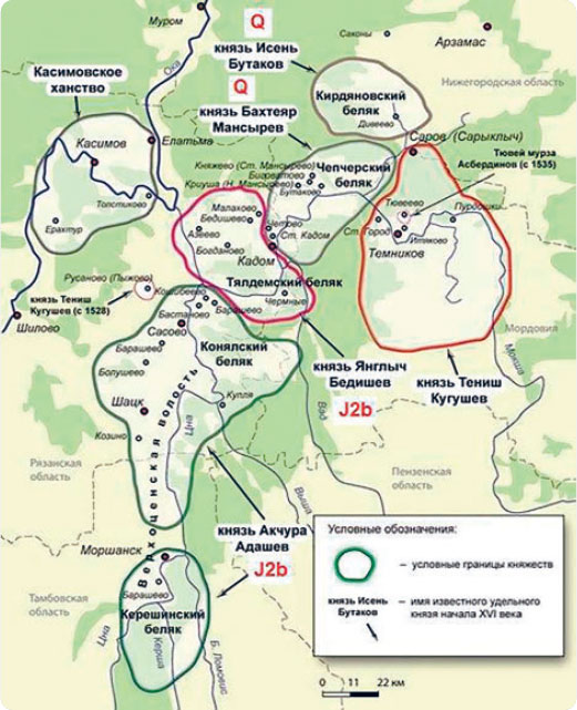 В Мещерском регионе существовали шесть территорий татарских княжеств, создавшие впоследствии династии со следующими фамилиями: Акчурины, Еникеевы, Енгалычевы, Мансыревы, Девлеткильдеевы, Бутаковы и другие роды, родственные им или происходящие от них. Все шесть локализованных княжеств находились на территории нынешних Темниковского, Кадомского и Шацкого уездов и имели непосредственное отношение к темниковским, кадомским и шацким служилым татарам. Часть этих земель была расположена на территории Пензенского края. Правящий князь, как правило, становился родоначальником новой фамилии. При этом фамилия образовывалась от имени князя, например, Акчура – Акчурины, реже – от отчества, например, Мамет Теребердеев – Теребердеевы.
