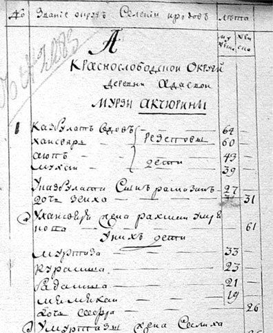 Имеются в архивных документах фамилии татарских мурз Бегиша Мещерова и его потомков «Абушая Умрякова с прочими» и Исляма Курмашева, потомков мурзы Ислама Исламова из татарской д. Адаевой Краснослободской округи. В том документе-ведомости «Делам татарских мурз и князей доказательства благородства, вступившим 1787 г.» в Пензенское дворянское депутатское собрание имеется запись в прошении «о благородственном происхождении рода» от Мухая Мустаева «с протчими», потомков мурзы князя Адаша и сына его Акчуры: «Грамоту, данную 7017 г. (1509 г.) о пожалованном Акчуре мурзе Адашева сына княжение над конялской мордвою 7083 г[73]. Изекея мурзы Булушева сына Акчурина жалован за неизменную службу ясаком над мордвою 7193 года, …детям князя Акчуриных…» (ГАПО, ф. 196, оп. 1, д. 20)[74].